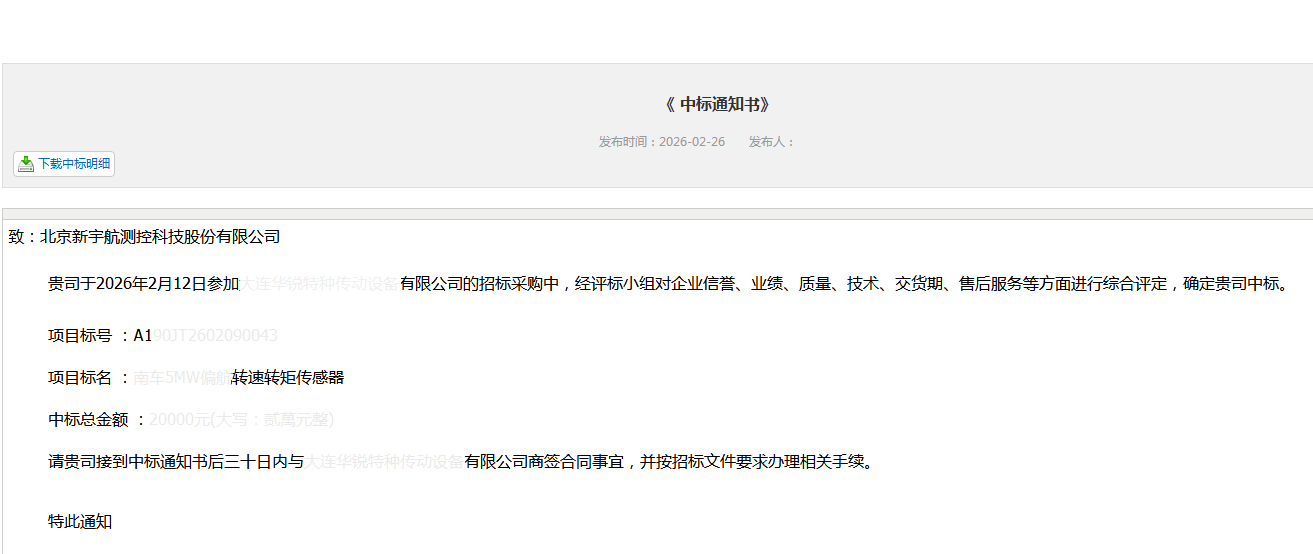 date 2026/3/2 10:19:06 砥礪前行再創(chuàng)輝煌 我公司成功中標(biāo)某大型國企轉(zhuǎn)矩轉(zhuǎn)速傳感器項(xiàng)目 近日,我公司憑借卓越的技術(shù)實(shí)力、可靠的產(chǎn)品質(zhì)量和完善的服務(wù)體系,在激烈的市場(chǎng)競(jìng)爭(zhēng)中脫穎而出,成功中標(biāo)某大型國有企業(yè)集團(tuán)重點(diǎn)項(xiàng)目的轉(zhuǎn)矩轉(zhuǎn)速傳感器采購。此次中標(biāo)不僅標(biāo)志著新宇航在工業(yè)傳動(dòng)測(cè)量領(lǐng)域的又一次關(guān)鍵突破,更是國有大型企業(yè)對(duì)“新宇航”品牌技術(shù)底蘊(yùn)與創(chuàng)新能力的高度認(rèn)可,為公司進(jìn)一步拓展市場(chǎng)版圖奠定了堅(jiān)實(shí)基礎(chǔ)。 此次中標(biāo),對(duì)于新宇航而言,既是榮譽(yù),更是責(zé)任。公司相關(guān)負(fù)責(zé)人表示,將組織精干技術(shù)團(tuán)隊(duì),嚴(yán)把質(zhì)量關(guān),確保按期交付高標(biāo)準(zhǔn)的轉(zhuǎn)矩轉(zhuǎn)速傳感器及配套系統(tǒng),為國家的工業(yè)安全與智能化轉(zhuǎn)型貢獻(xiàn)“新宇航”的力量。 未來,北京新宇航將繼續(xù)堅(jiān)持走科研成果商品化、商品生產(chǎn)產(chǎn)業(yè)化、產(chǎn)品質(zhì)量國際化的發(fā)展道路,依托擁有的近百項(xiàng)國內(nèi)外專利技術(shù),持續(xù)為我國從“制造大國”邁向“制造強(qiáng)國”提供精確、可靠的“中國感知”。